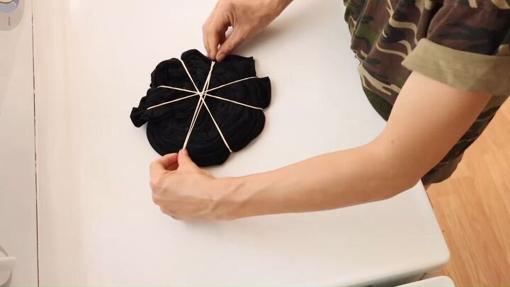 Keep swirling the fabric until the whole shirt is in a spiral. Using your fingers pinch the center of the fabric and twist. Use 3 or 4 rubber bands to hold your item in place evenly spacing out the bands.